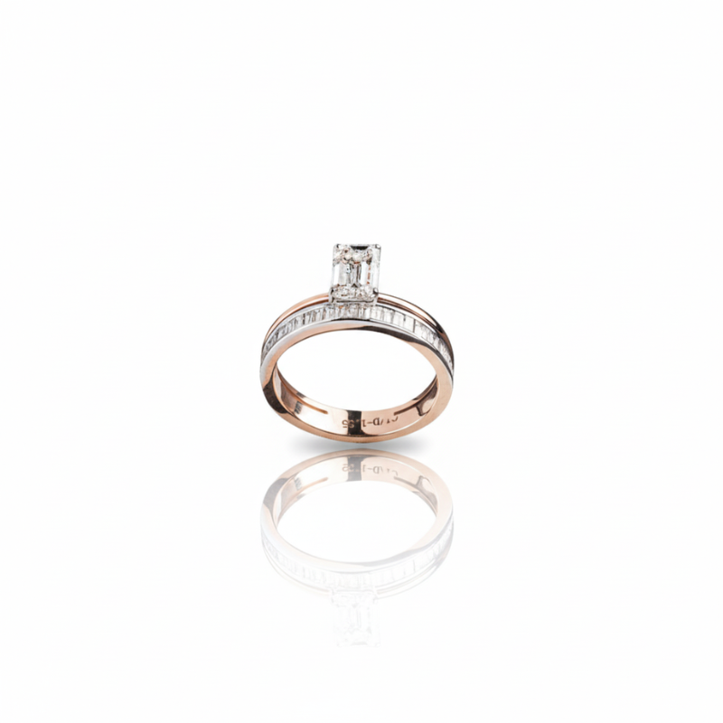 A timeless emerald-cut solitaire diamond set on a sleek band of channel-set baguettes. Understated elegance for everyday sophistication.