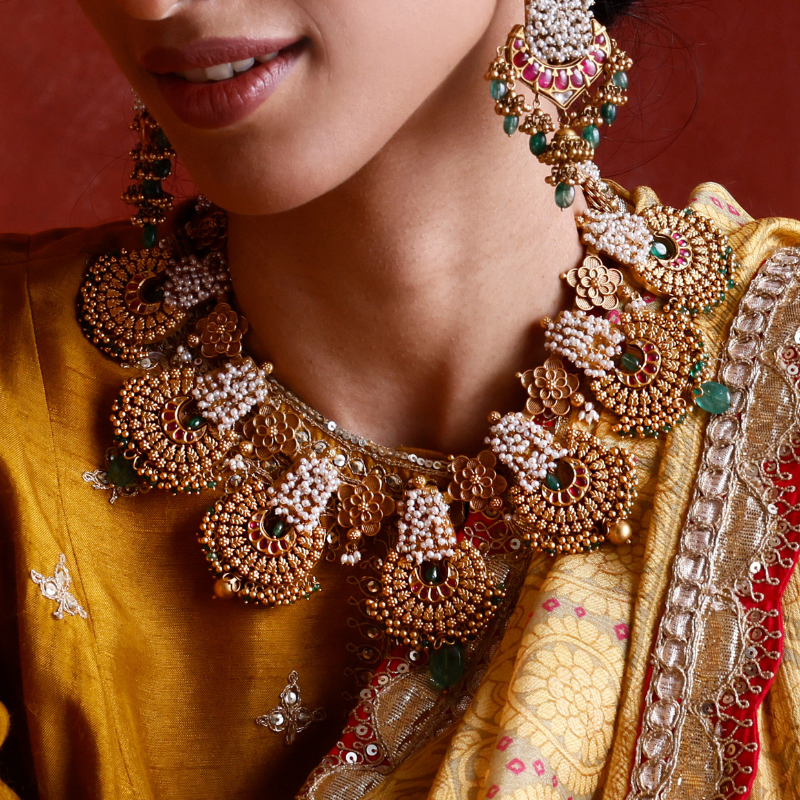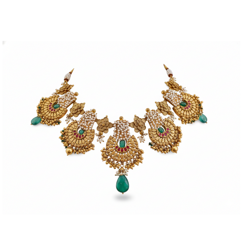 A grand handcrafted necklace adorned with intricate gold motifs, pearl strands, and vibrant emerald drops — capturing the essence of South Indian heritage and divine artistry.