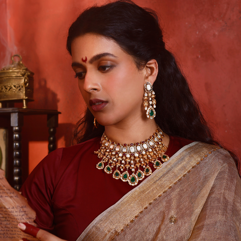 The choker boasts a striking design of uncut diamonds (Polki) interspersed with rich red gemstones and elegant green colour stone drops, all set in antique gold. The coordinating earrings mirror this grandeur creating a truly majestic look perfect for grand celebrations.