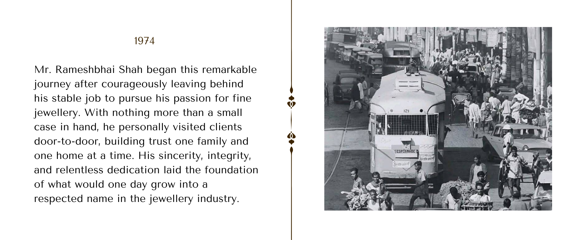 In 1974 Rameshbhai Shah set out from Kolkata’s bada bazaar area with a small case of jewellery and a quiet determination. He went door to door, meeting clients personally, building trust through sincerity, one home at a time. Rameshbhai was a man of deep faith. His days were filled with simple rituals - early mornings, handwritten ledgers & daily prayers. His work was guided by integrity and precision. Every clasp, every prong, every stone that left his hands carried not just beauty, but a promise.
