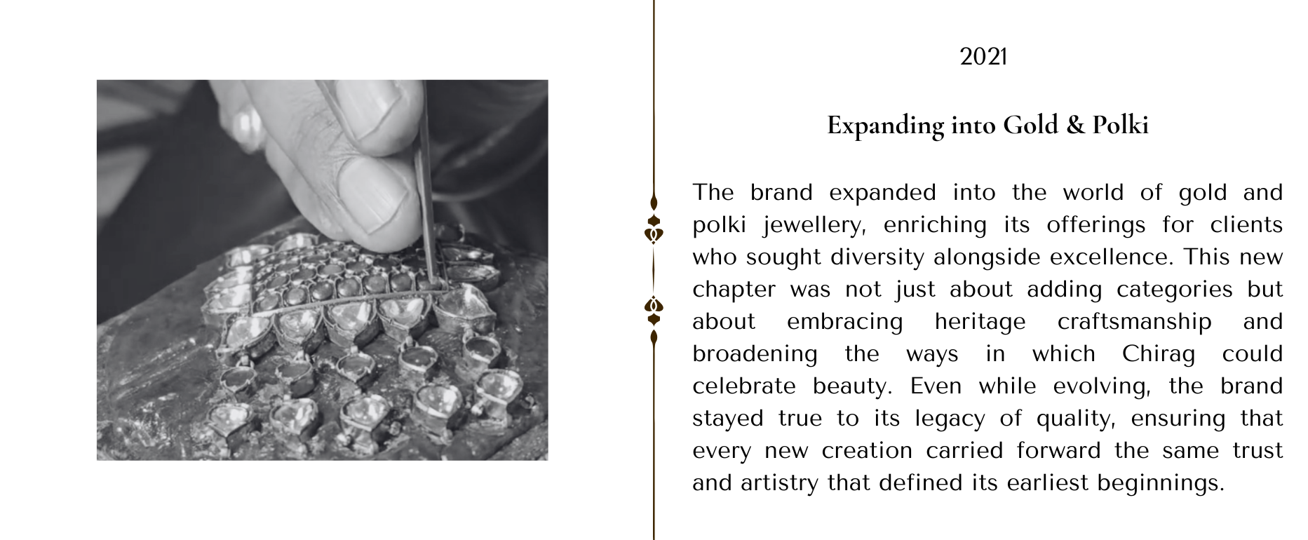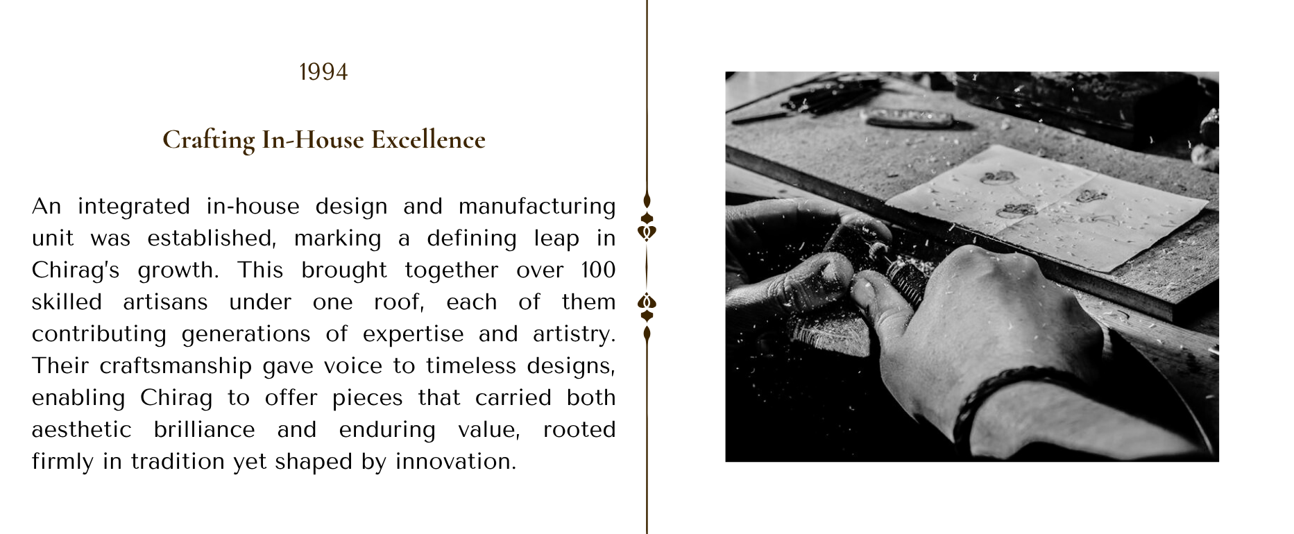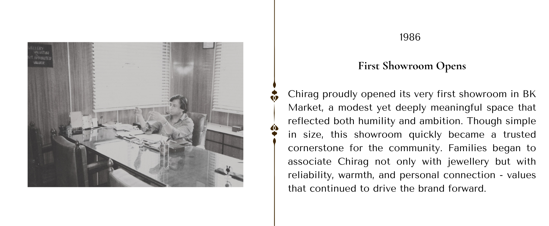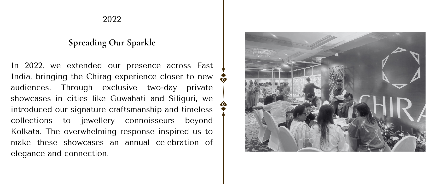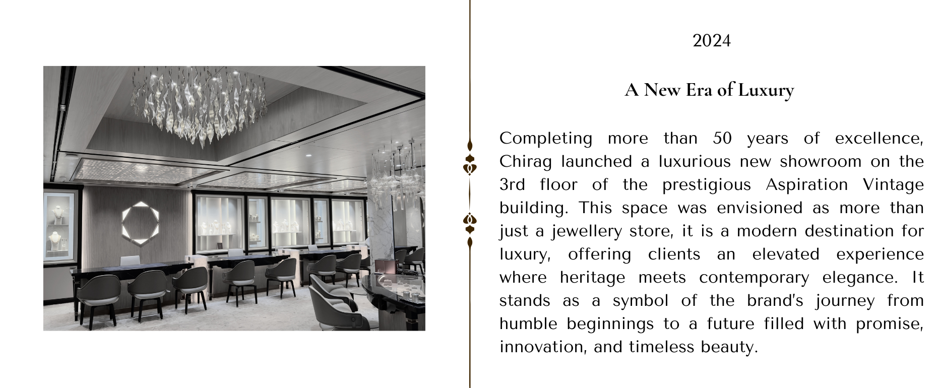 From a humble beginning in 1973 to becoming one of East India's most trusted names in fine jewellery, Chirag Jewellers has grown through decades of craftsmanship, innovation, and unwavering commitment to quality. Our timeline reflects this remarkable journey, marking milestones of creativity, expansion, and the evolution of timeless design that continues to define who we are today.