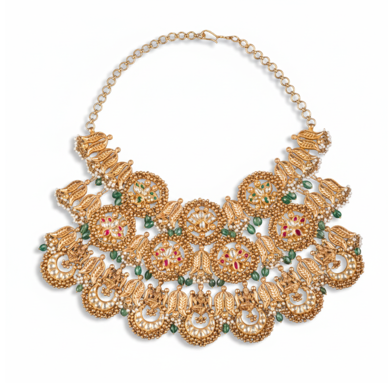 An opulent gold necklace inspired by South Indian temple artistry, intricately designed with polki, Zambian emerald beads, pearls, and semi-precious stones — a masterpiece of heritage and grandeur.